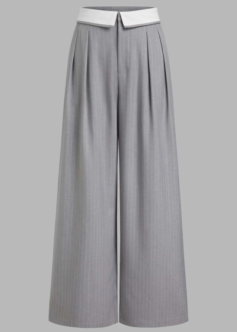 Este pantalón de tiro alto presenta un diseño de rayas grises con una pretina blanca, que aporta un aire fresco y moderno. Su corte ancho y fluido lo hace ideal para el uso diario, ofreciendo comodidad y estilo. Perfecto para combinar con una blusa blanca o un top de color sólido, es una opción versátil para diversas ocasiones.