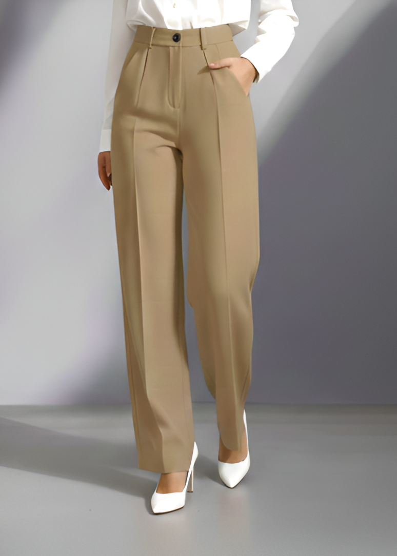 Tiro alto con pinzas frontales, corte recto y caída elegante. Un básico infaltable para armar looks prolijos, modernos y súper favorecedores. Su tono camel lo vuelve súper combinable para día o noche.